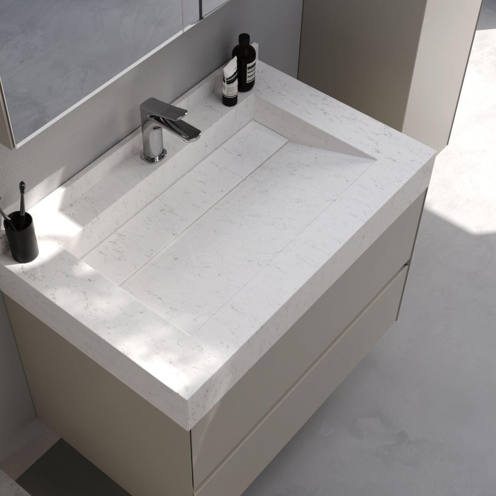 The washbasin is made from high-quality composite material, combining durability with a sleek, modern design. It is resistant to stains, scratches, and moisture, while offering a hygienic and easy-to-clean surface suitable for everyday use.